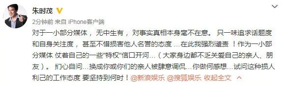 朱时茂本人也发微博表示:“对于一小部分媒体,无中生有,对事实真相本身毫不在意。只一味追求话题度和自身关注度,甚至不惜损害他人名誉的态度…在此我强烈谴责!作为一小部分媒体,仗着自己的一些“特权”信口开河…(大家身边都不乏关爱自己的亲人、朋友)。扪心自问…换成你或你们的亲人被肆意调侃…你做何感想…试问这种损人利己的工作态度 要坚持到何时!”