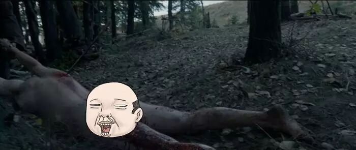 原版中,这一幕之后,有一个俯拍马尸的全景镜头——